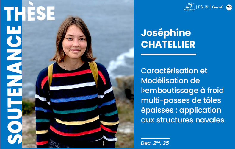 Joséphine Chatellier a réalisé ses travaux de recherche au sein de l‘équipe CSM sous la direction de Pierre-Olivier Bouchard et Christophe Pradille. Elle soutiendra sa thèse de doctorat en Mécanique Numérique et Matériaux le 2 décembre 2025 sur le sujet :