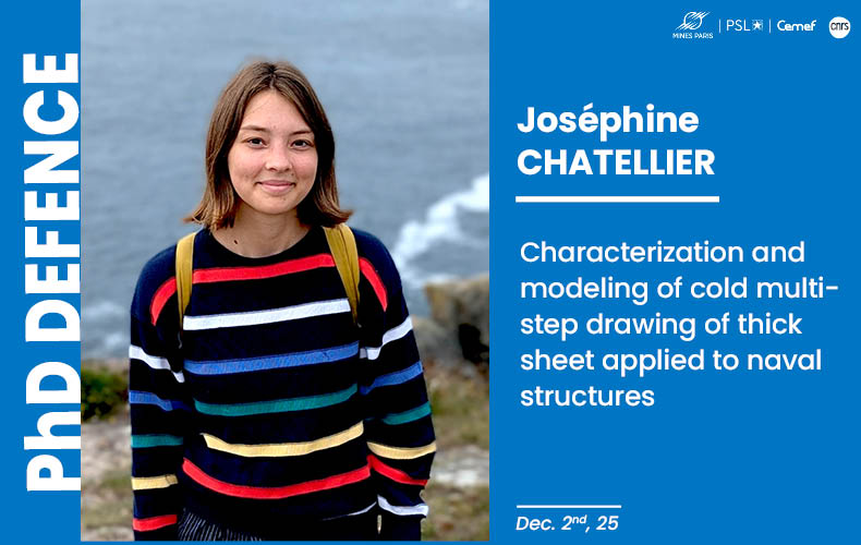 Joséphine Chatellier conducted her doctoral research in the CSM team under the supervision of Pierre-Olivier Bouchard and Christophe Pradille. She defends her PhD in Computational Mechanics and Materials specialty on Dec. 2nd, 2025 on: